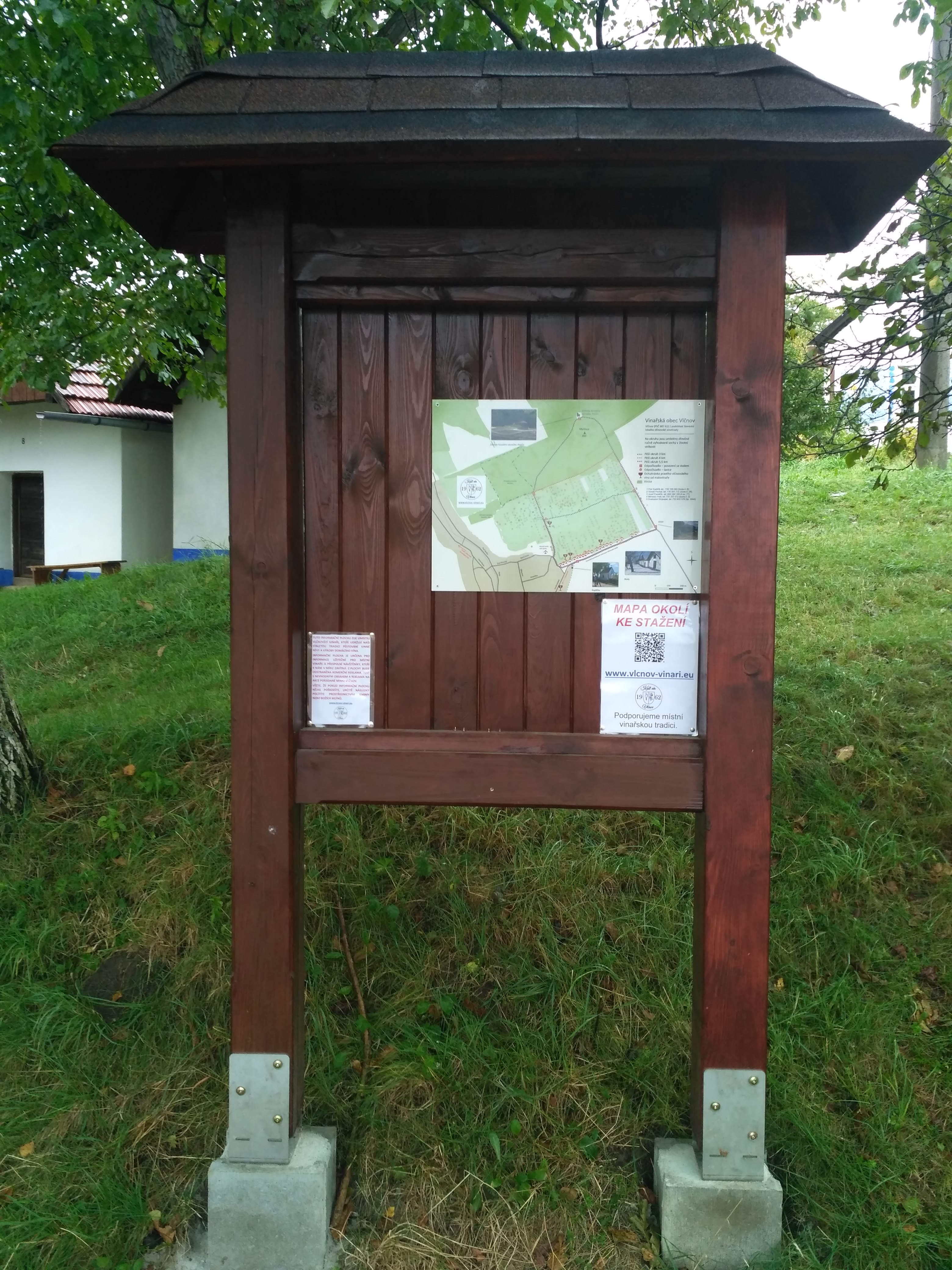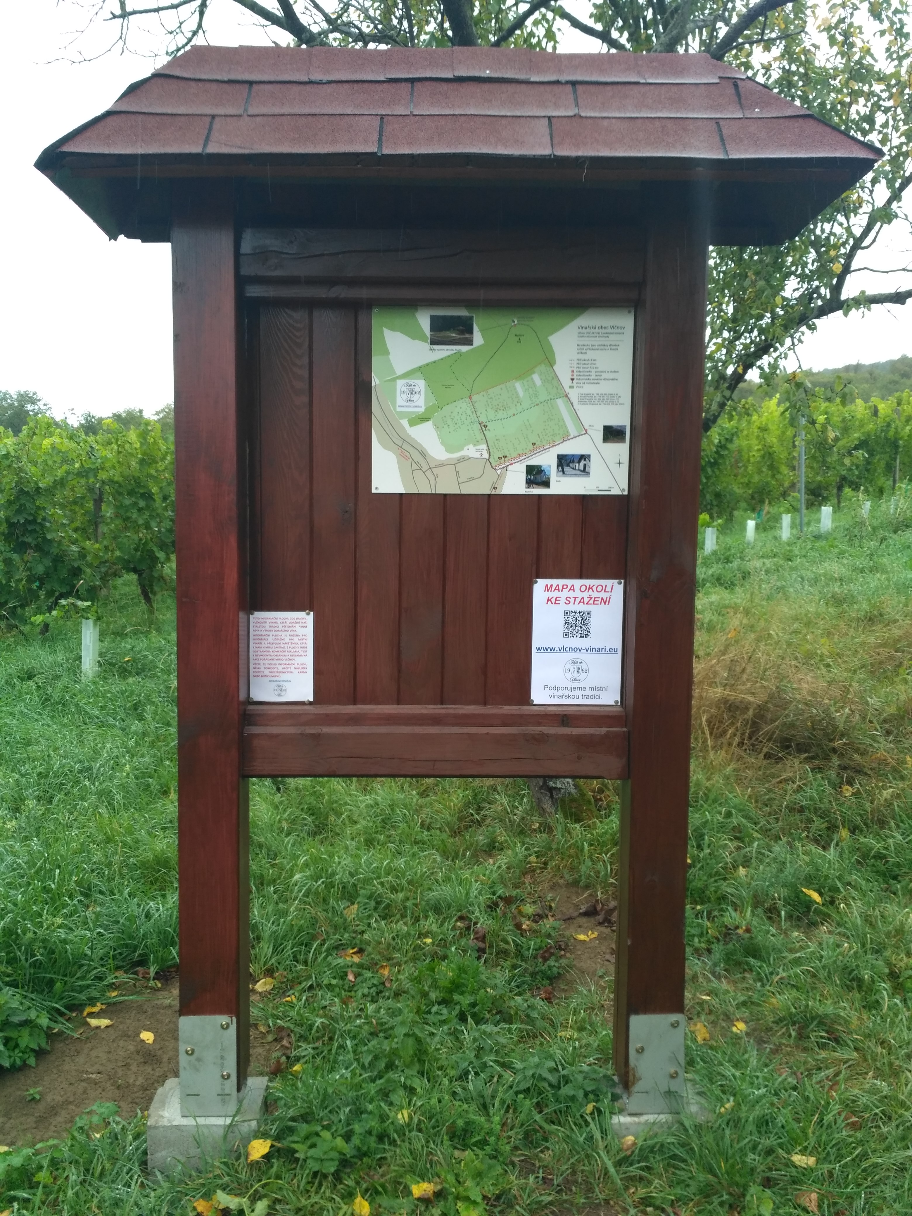 V tomto roce jsme vybudovali dvě informační vitríny ve vlčnovských vinohradech. Tam se kolemjdoucí dozvědí základní informace o okolních zajímavostech, plánovaných akcích a třeba i najdou kontakt pro ochutnání toho našeho pravého vlčnovského vína. První vitrínu jsme postavili vedle příjezdové cesty k búdám naproti kapličky. Druhou vitrínu jsme umístili vedle nového altánu, který byl na jaře postaven namísto zbourané rozhledny. Se stavbou pomáhali vinaři, kamarádi a také rodina. Ve vitrínách je umístěna mapa okolí a stejnou mapu si také může každý načíst do mobilního telefonu přes vyobrazený QR kód. Vitríny jsou určeny pro informace užitečné pro místní vinaře a přespolní návštěvníky, kteří do vinohradů v míru zavítají.